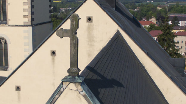 S dronem lze dělat i nezbytná fotodokumentace stavu staveb a jejich následné opravy. Zde je dobře vidět poškození kříže a praskliny v jeho základně.